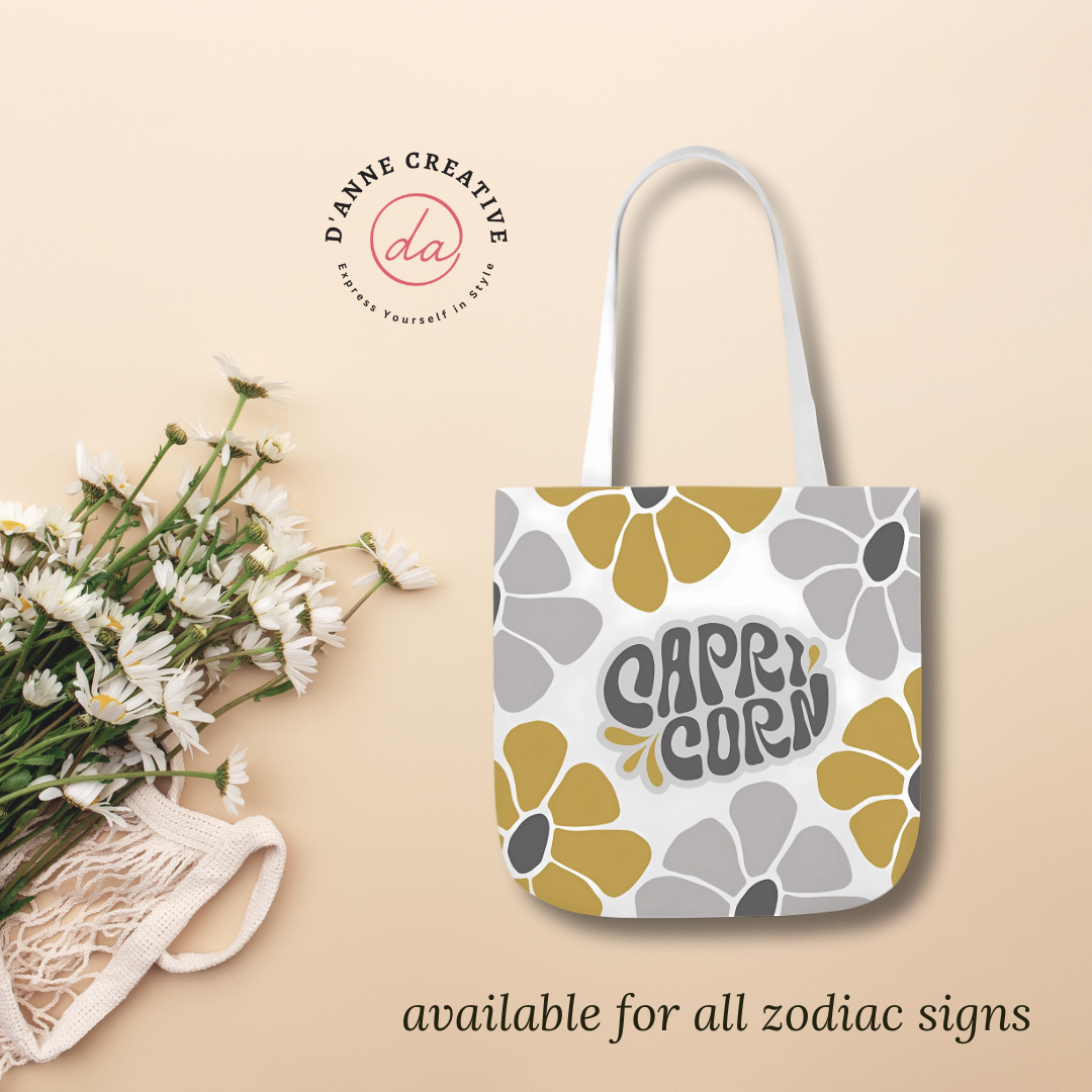 Lightweight, durable, and designed to showcase your artwork in picture-perfect quality, this polyester canvas tote bag is a must-have! Featuring a cute and vintage-inspired design, it beautifully displays delicate flowers and the name of each zodiac sign—like Capricorn, making it a stylish and personalized accessory. The tote also includes a sleek black interior and comfortable straps available in two stylish colors, combining practicality with charm. Perfect for astrology lovers who want to carry their sign with elegance! ✨♉🌸